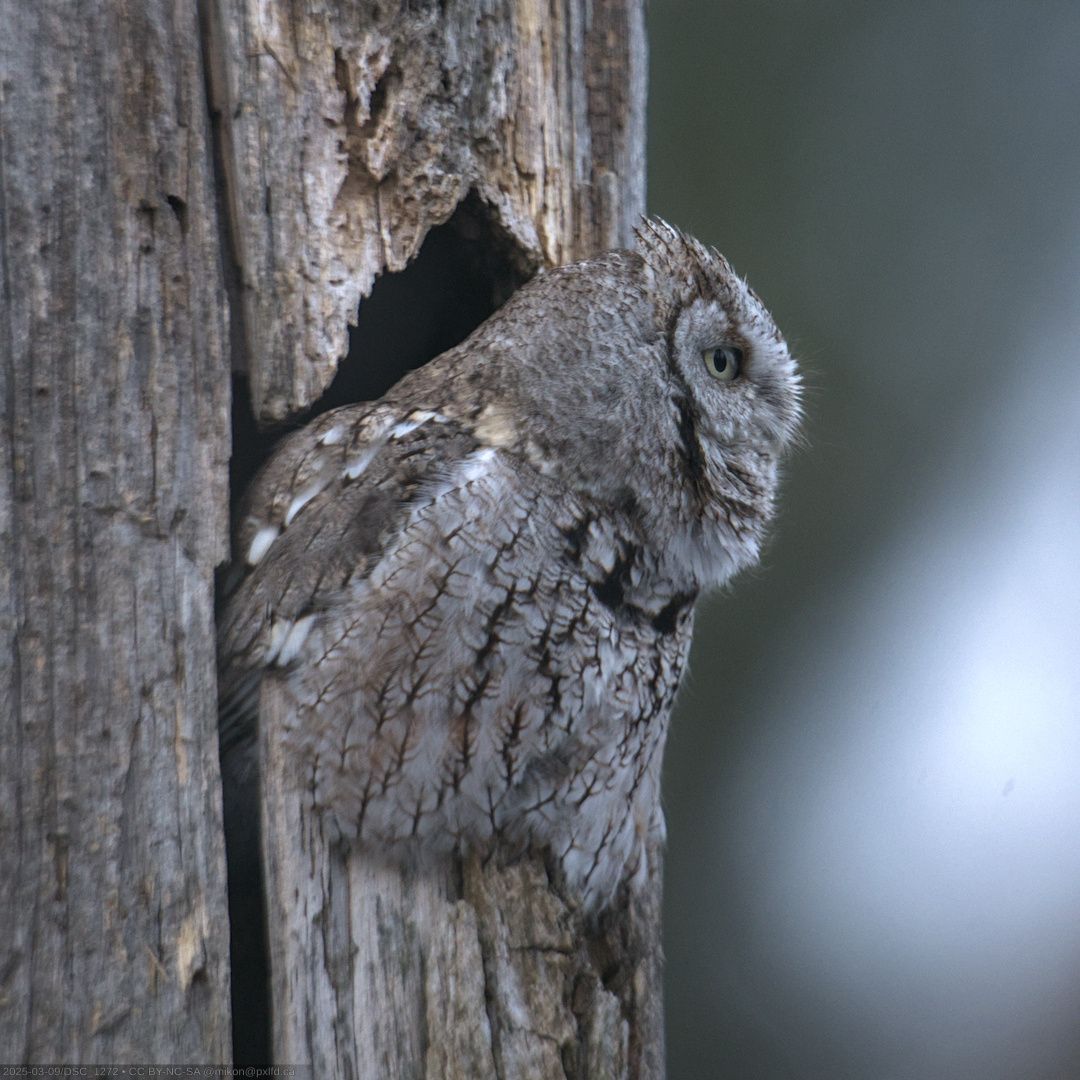 An eastern screech owl (Petit-duc maculé en français) waking up for the evening hunt.