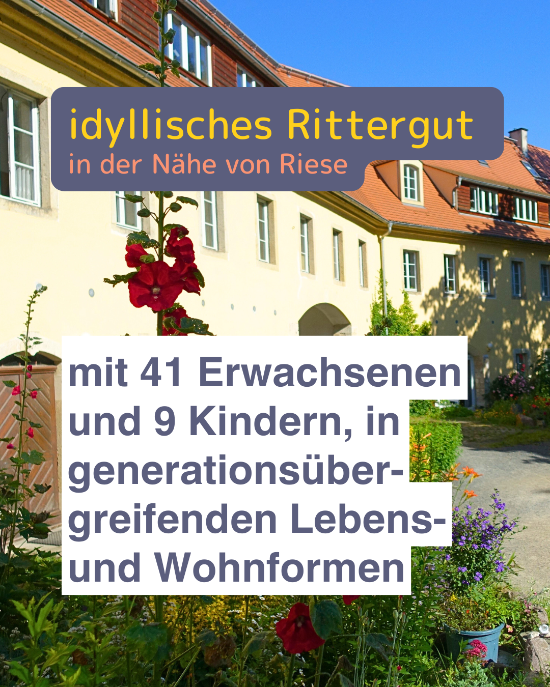Das #Wohnprojekt gibt es bereits seit 2001. Auf dem idyllischen alten #Rittergut nahe Riesa wohnen 41 Erwachsenen und 9 Kindern in generationsübergreifenden Lebens- und Wohnformen.