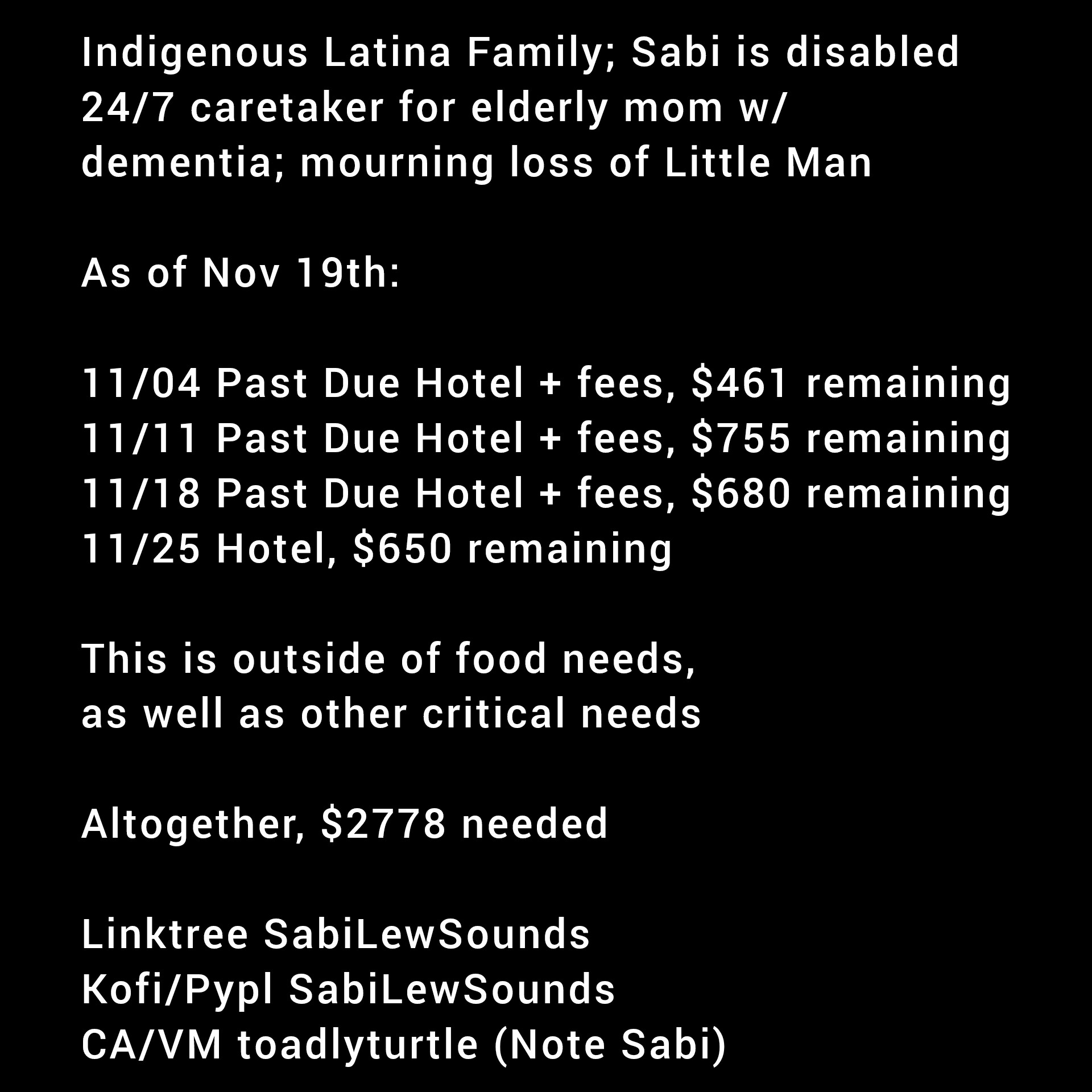 Disabled #Indigenous Latina family, #homeless; mourning loss of Little Man (ESA bun) Hotel going back to Nov 20th remains not covered Linktr.ee/SabiLewSounds KOFI/PYPL SabiLewSounds CA/VM toadlyturtle (Note: Sabi) #HelpFolksLive2025 #HelpSky #MentalHealthAdvocate #LatinaMusician #DisabledArtist