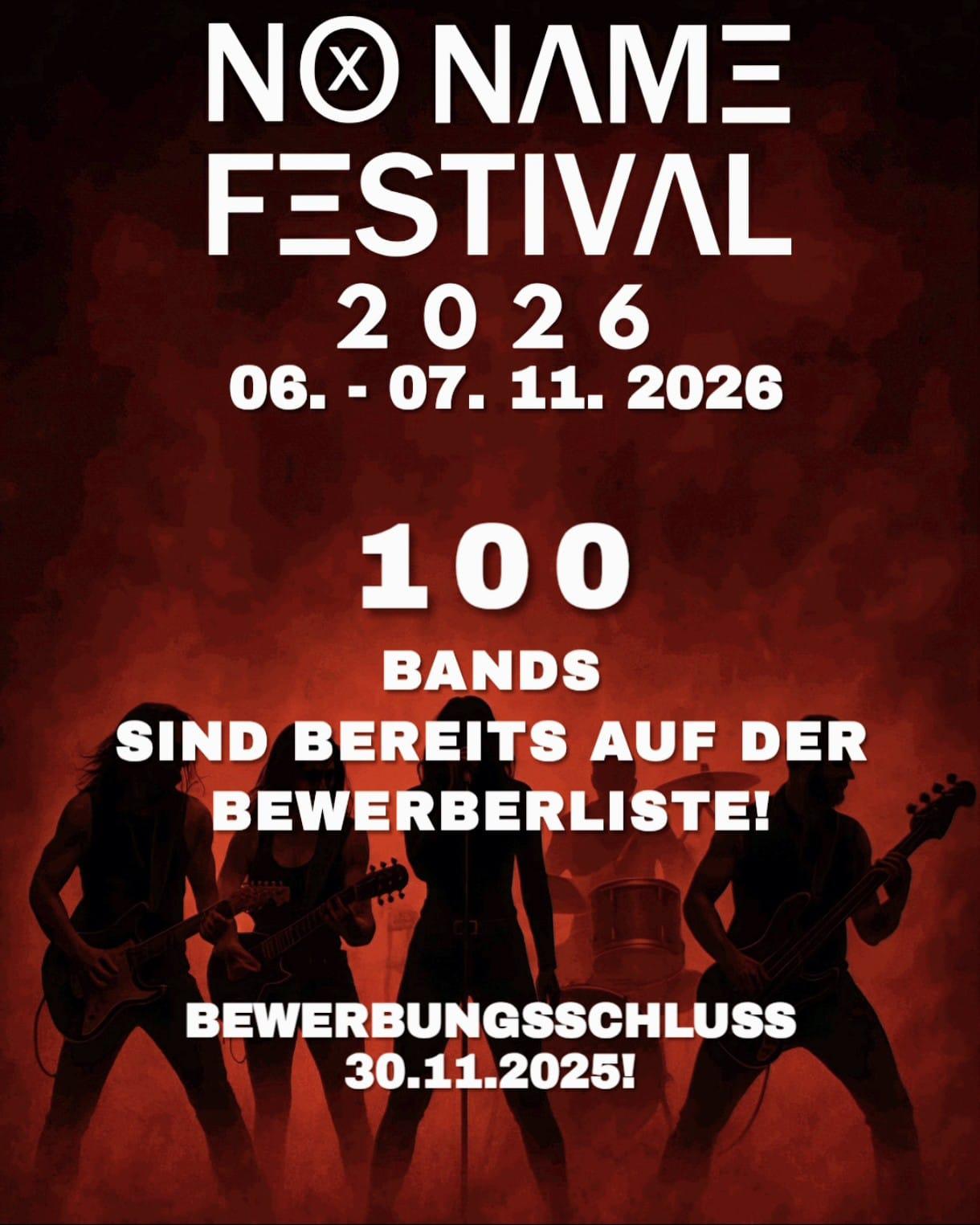 Wow! 🎸 Wir haben schon über 100 Bands auf unserer Bewerberliste für das No Name Festival – danke an alle Bands, die sich bereits gemeldet haben! ❗Bewerbungen laufen noch bis 30.11.2025 – jetzt oder nie!