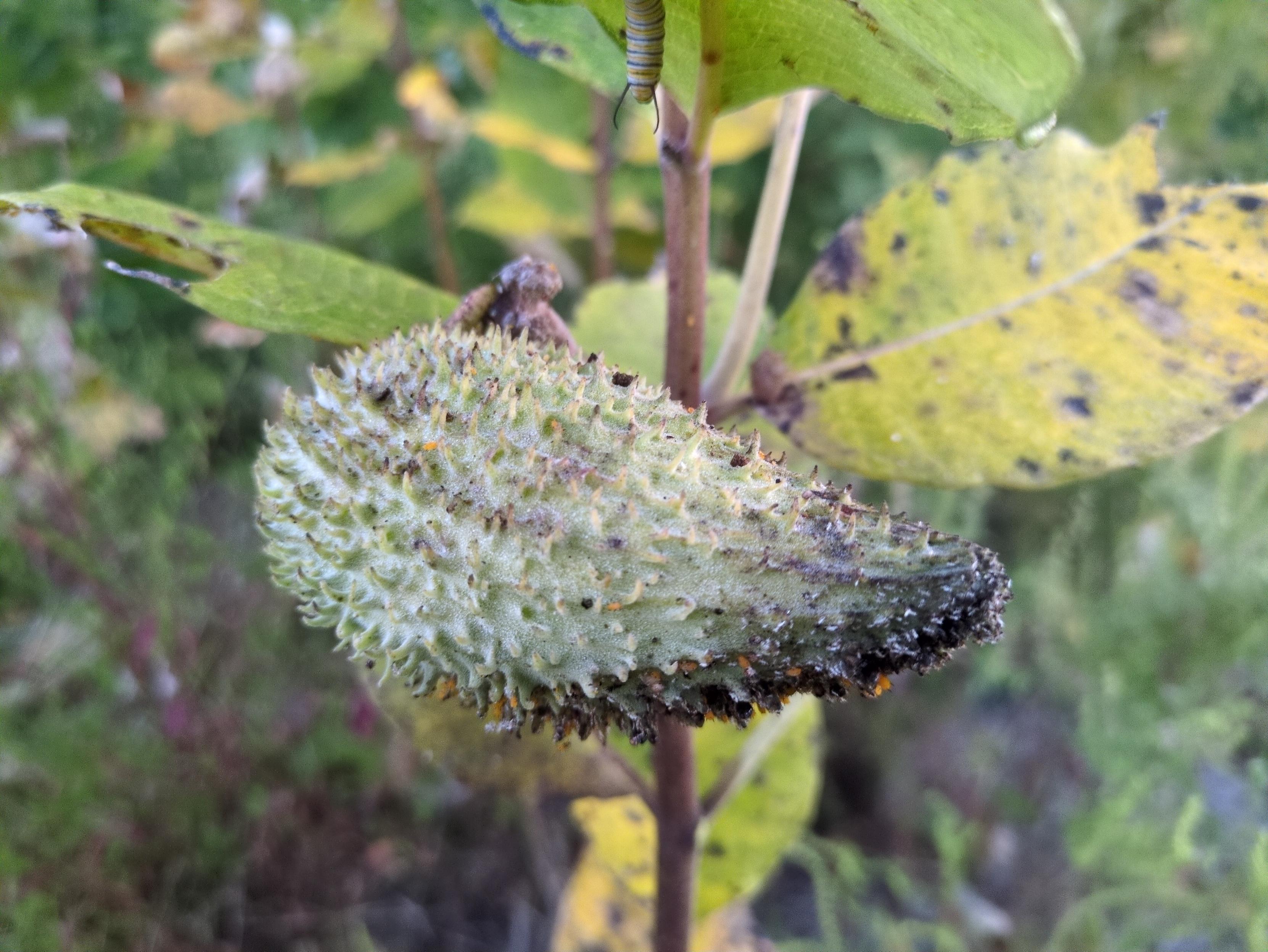 A close-up photo of a milkweed pod against a background of foliage. At the center-top of the frame, easy to miss, is a striped caterpillar hanging down, presumably from a leaf that is out of sight.