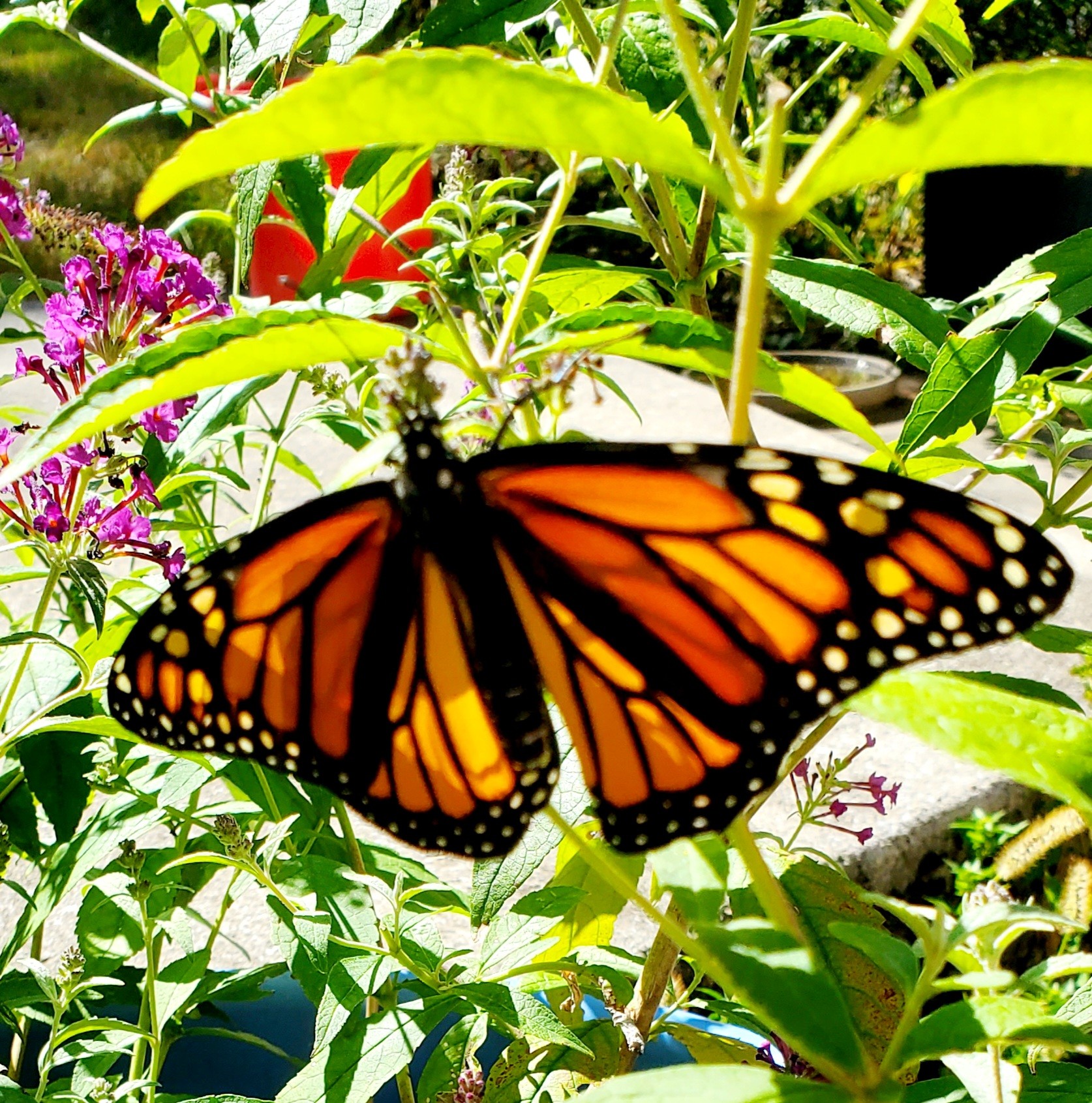 One perfect monarch with outspread wings perched on our purple butterfly bush. The sun behind it makes it shine like stained glass.
