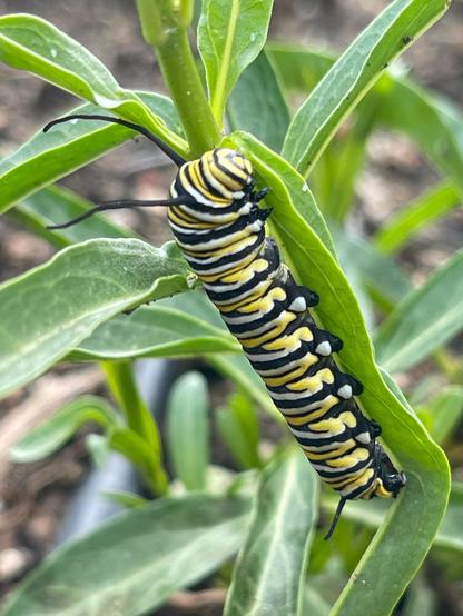 Caterpillar with yellow, white, and black bands munching upside down on a lanceolate leaf.