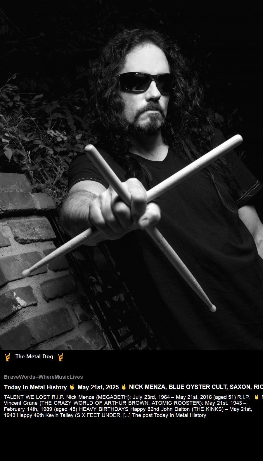 TALENT WE LOST R.I.P. Nick Menza (MEGADETH): 1964 – 2016 (aged 51) R.I.P. Vincent Crane (THE CRAZY WORLD OF ARTHUR BROWN, ATOMIC ROOSTER): 1943 – 1989 (aged 45) HEAVY BIRTHDAYS Happy 81st John Dalton (THE KINKS) - 1943 Happy...