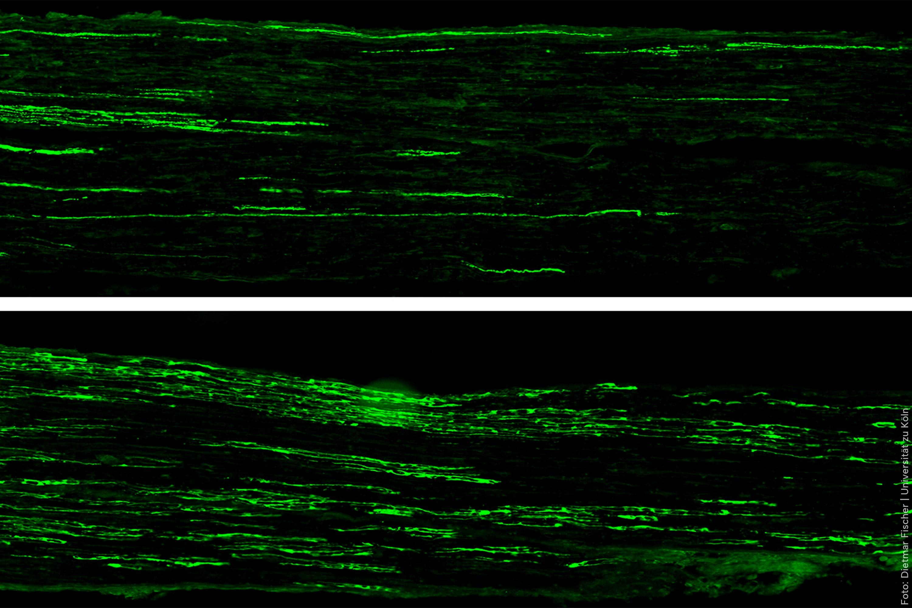 Zwei Aufnahmen von Nervenfasern, zeigen grüne fluoreszierende Strukturen auf schwarzem Hintergrund.