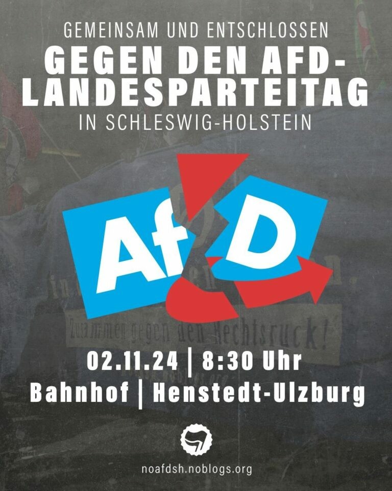 Am Samstag wollen die AfD Landesverbände Hamburg und Schleswig-Holstein ihren gemeinsamen Wahlkampfabschluss in der Friedrich-Ebert-Halle in Hamburg-Harburg abhalten. Nach intensiven Wochen des Vorgehens gegen die landesweiten AfD-Umtriebe wollen wir deshalb auch aus Schleswig-Holstein gemeinsam in die Hansestadt reisen, um dort die antifaschistischen Aktionen gegen den Endpunkt des laufenden rechten Wahlkampfes zu unterstützen. Schließt euch uns an!