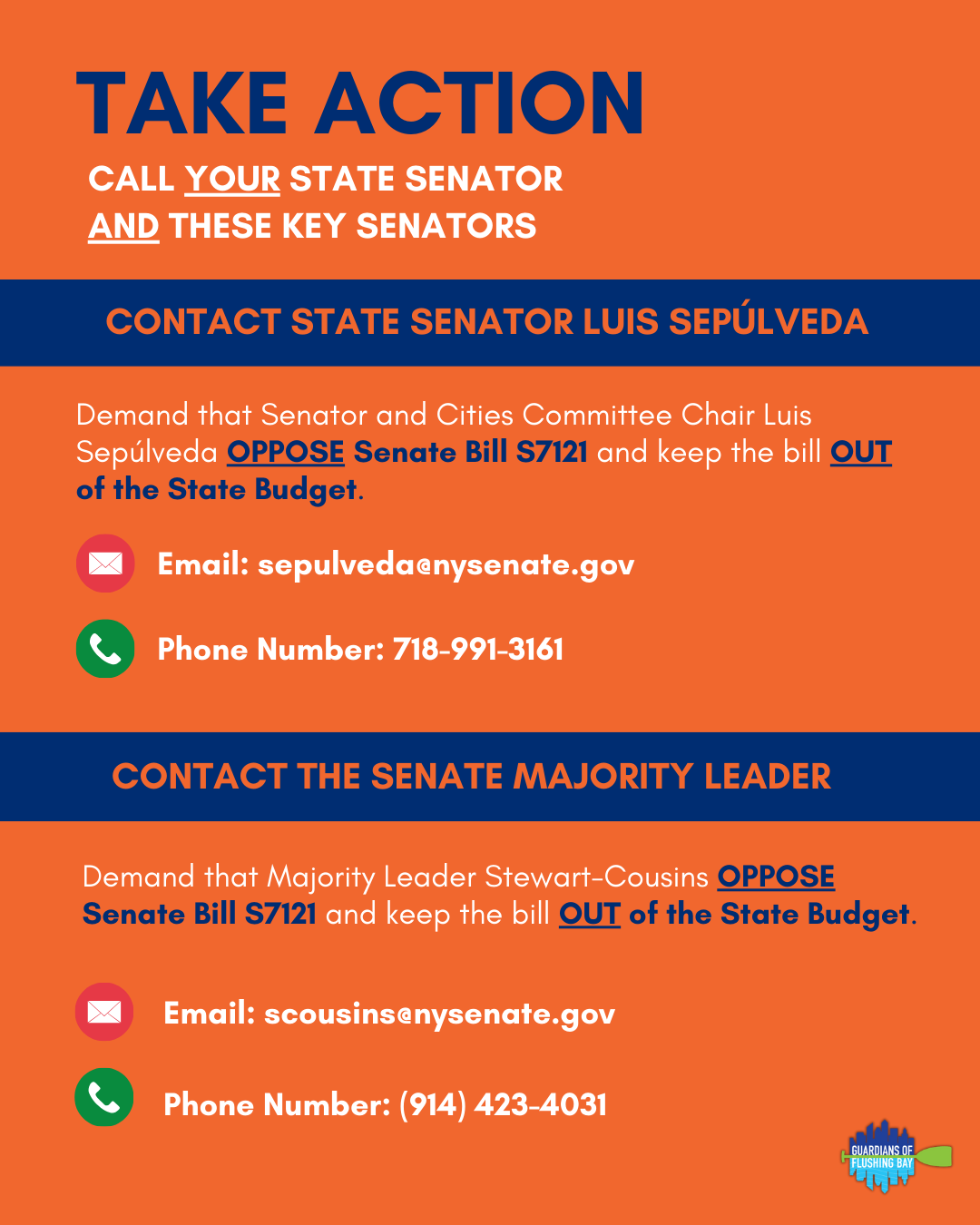 And email him, his Chief of Staff, Ms. Reyes, and his Community Affairs Liaison, Mr. Cardus: reyes@nysenate.gov, sepulveda@nysenate.gov, cardus@nysenate.gov