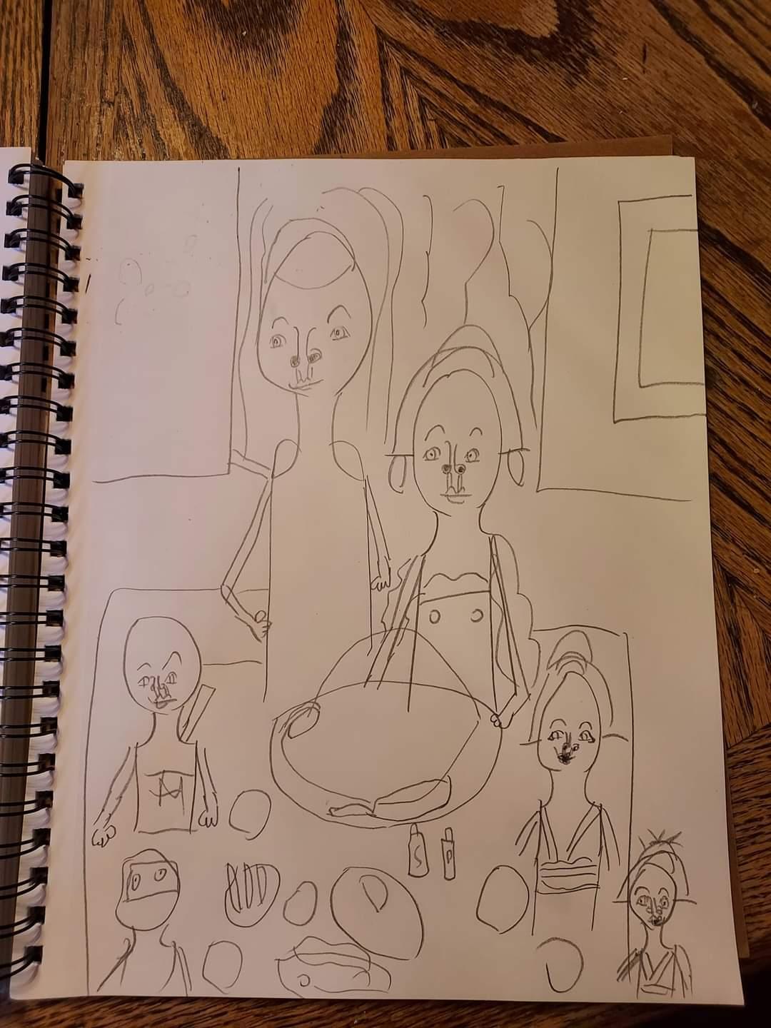 Happy Thanksgiving, everyone. A parody drawing of Norman Rockwell's painting of "Thanksgiving Dinner"/"Freedom From Want" in Japanese style. A drawing of me with a Japanese maid, samurai, ninja, Oiran, and a Japanese geisha/geiko/geigi woman in my Strathmore Sketch sketchbook.
