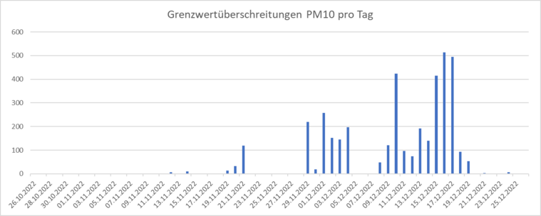 Der tägliche Grenzwert von 50 µg/m³ bei PM10 wurde in 28 % aller Messungen überschritten.