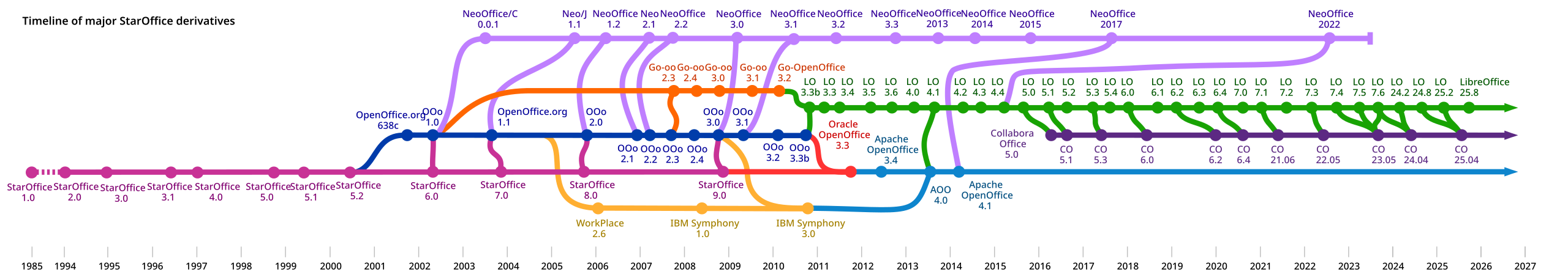 raízes privativas (StarOffice) que datam de 1985, OpenOffice tinha sido libertado pela Sun em 2000. Após a dissolução desta, em 2010, :oracle: teria se recusado a cumprir uma promessa de passar o projeto a uma fundação. Apenas em 2011 doou os ativos relacionados — bem como de alguns outros projetos então liderados pela Sun — para :apache:
