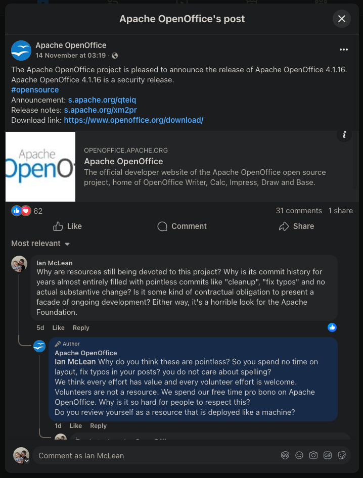 Apache OpenOffice estagnou, pois a maioria das pessoas responsáveis já tinha criado sua própria entidade,