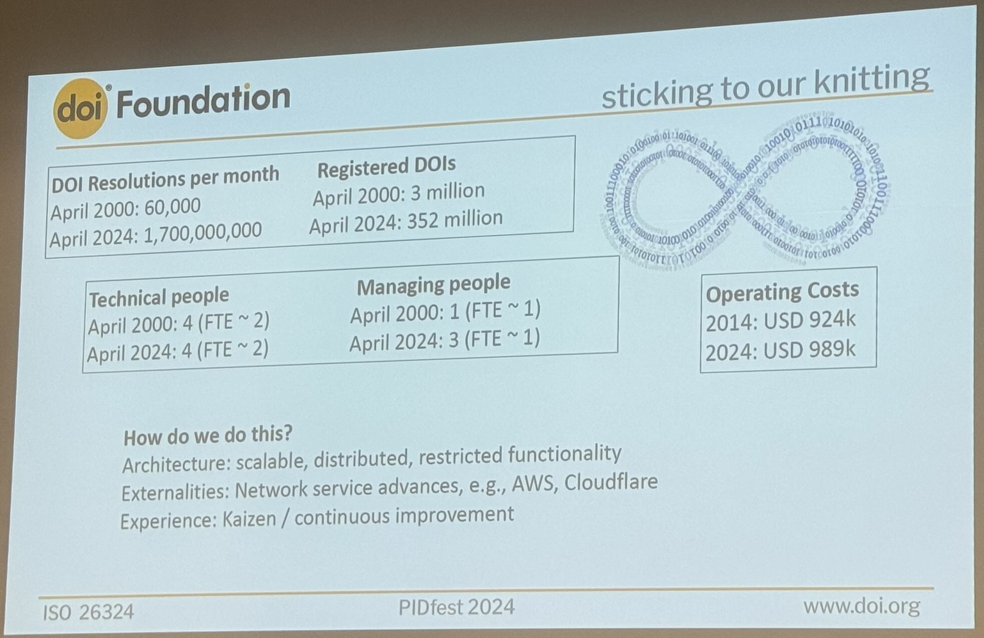 Each DOI resolution costs five millipennies. The DOI Foundation facilitates 1.7B resolutions per month across >350M registered DOIs with seven part-time staff (~3 FTE equivalent) for a total operating cost under 1M USD per year.