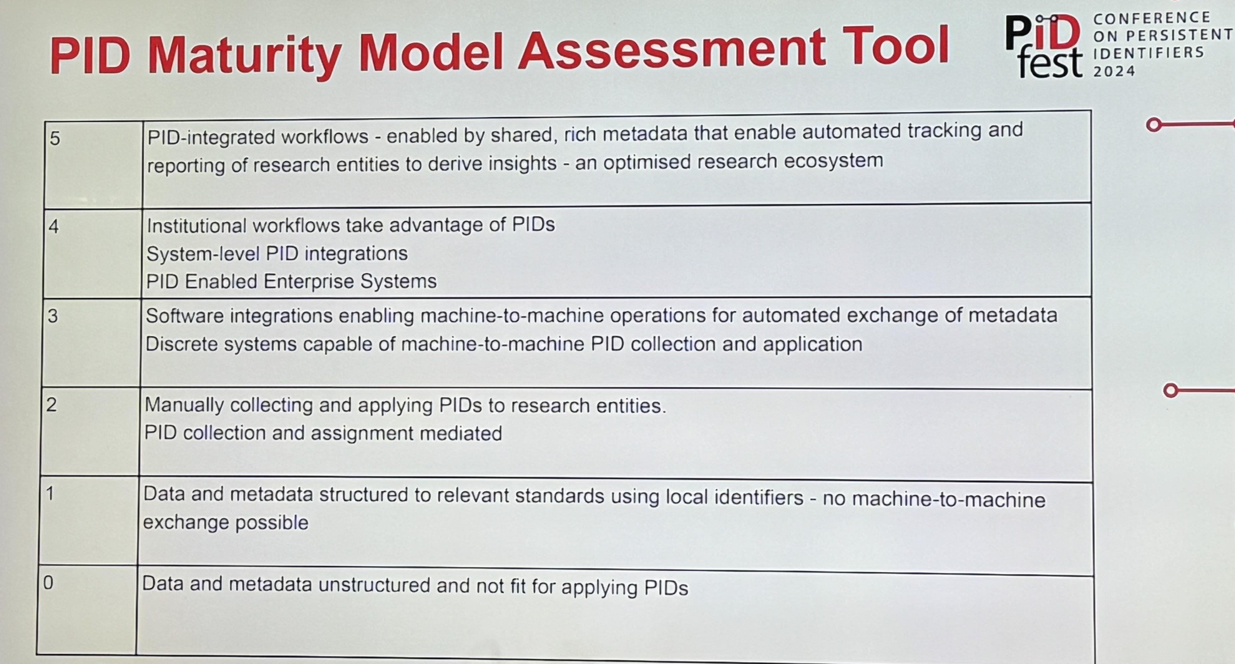 A concise maturity model for an organization's effective use of #PersistentIdentifiers ( #PIDs ), presented by Siobhann McCafferty and @pid_perth at #PIDFest: