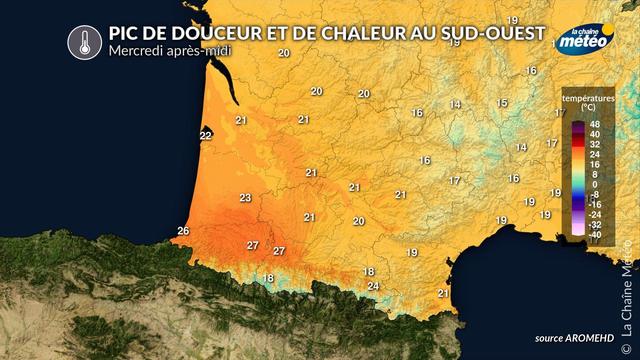 🌡️La #chaleur (un jour de chaleur correspond à une température = ou >25°C pour une ville donnée) concernera le sud de l'Aquitaine et la #Bigorre demain après-midi avec 26 à 27°C prévus de #Tarbes à #Pau et #Barritz. Il s'agira de 🏆#records pour une mi-novembre.