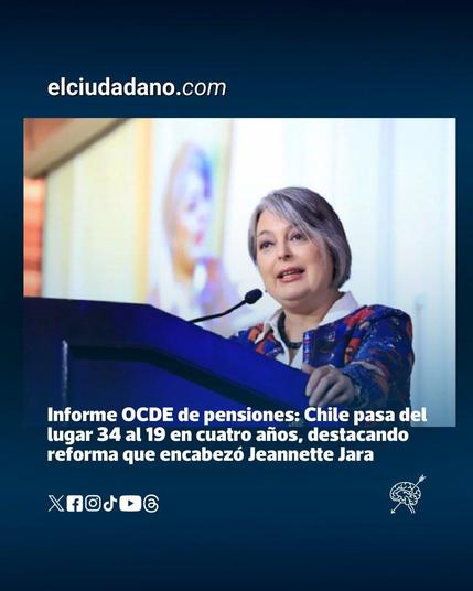 La OCDE destaca en su informe 2025 que la reforma previsional chilena mejora pensiones, especialmente de mujeres, y reduce la brecha de género. Chile escaló del puesto 34 al 19 en el ranking de tasas de reemplazo. La exministra Jeannette Jara, actual candidata presidencial del Pacto Unidad por Chile, arquitecta de la reforma, enfatiza: “Los cambios se logran con hechos, no con discursos”.