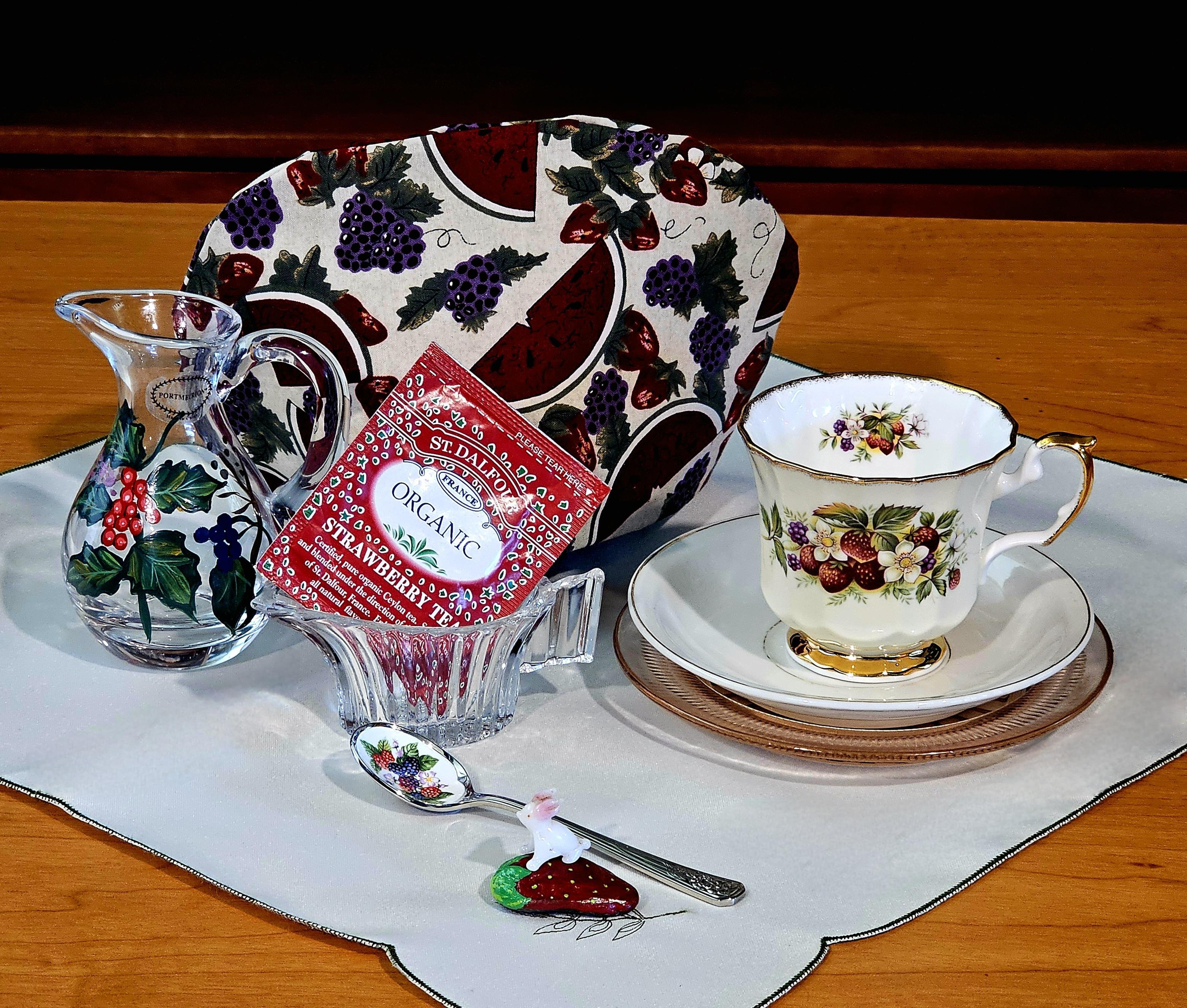 #Tea #Berries #RockPainting #Teableau #TeaCozy #TeaCosy #BlackTea #Handmade #Sewing #VintageChina #VintageGlass #Portmeirion #StDalfour #DepressionGlass #GlassArt #Miniatures #Bunny #Strawberry