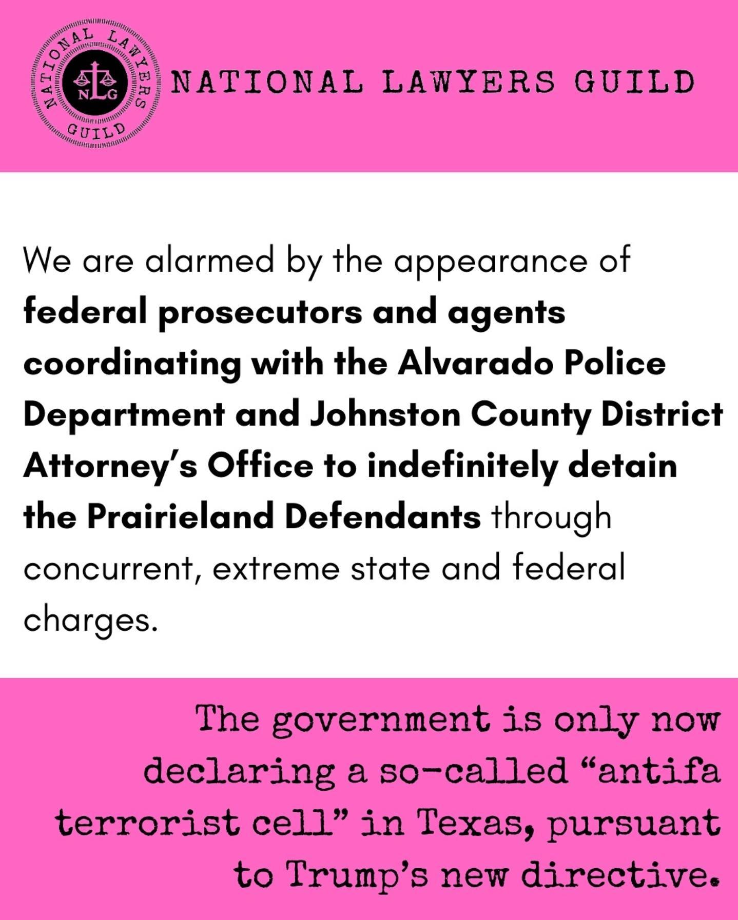 "We are alarmed by the appearance of federal prosecutors and agents coordinating with the Alvarado Police Department and Johnston [sic] County District Attorney's Office to indefinitely detain the Prairieland Defendants through concurrent, extreme state and federal charges.