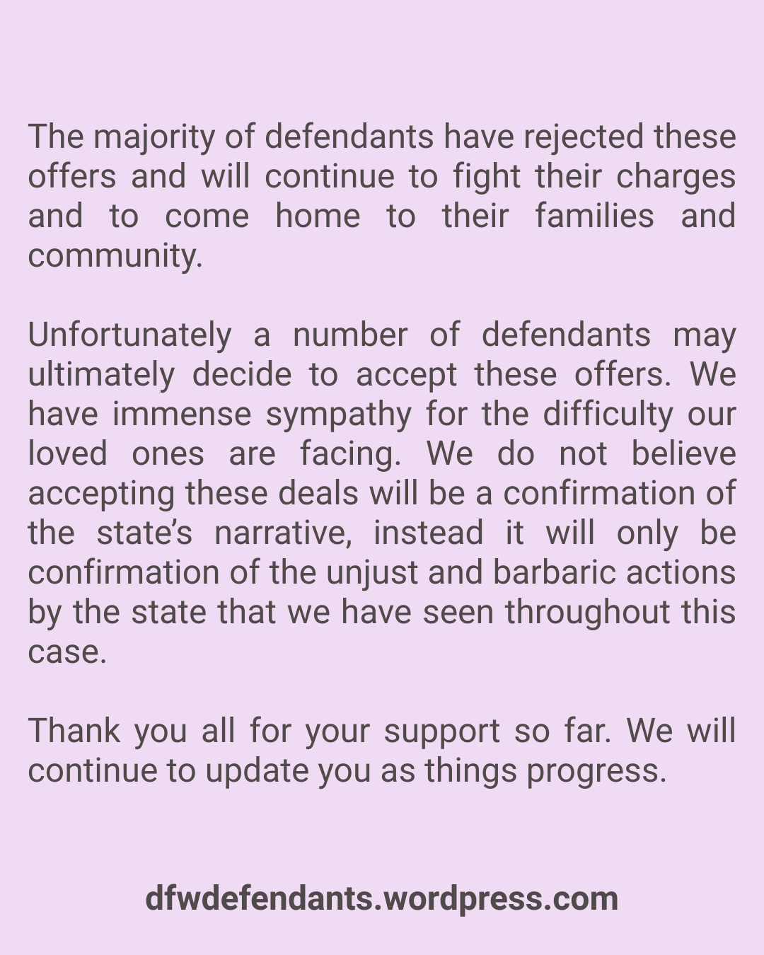 Please write to the defendants and read more about their case here: https://dfwdefendants.wordpress.com/