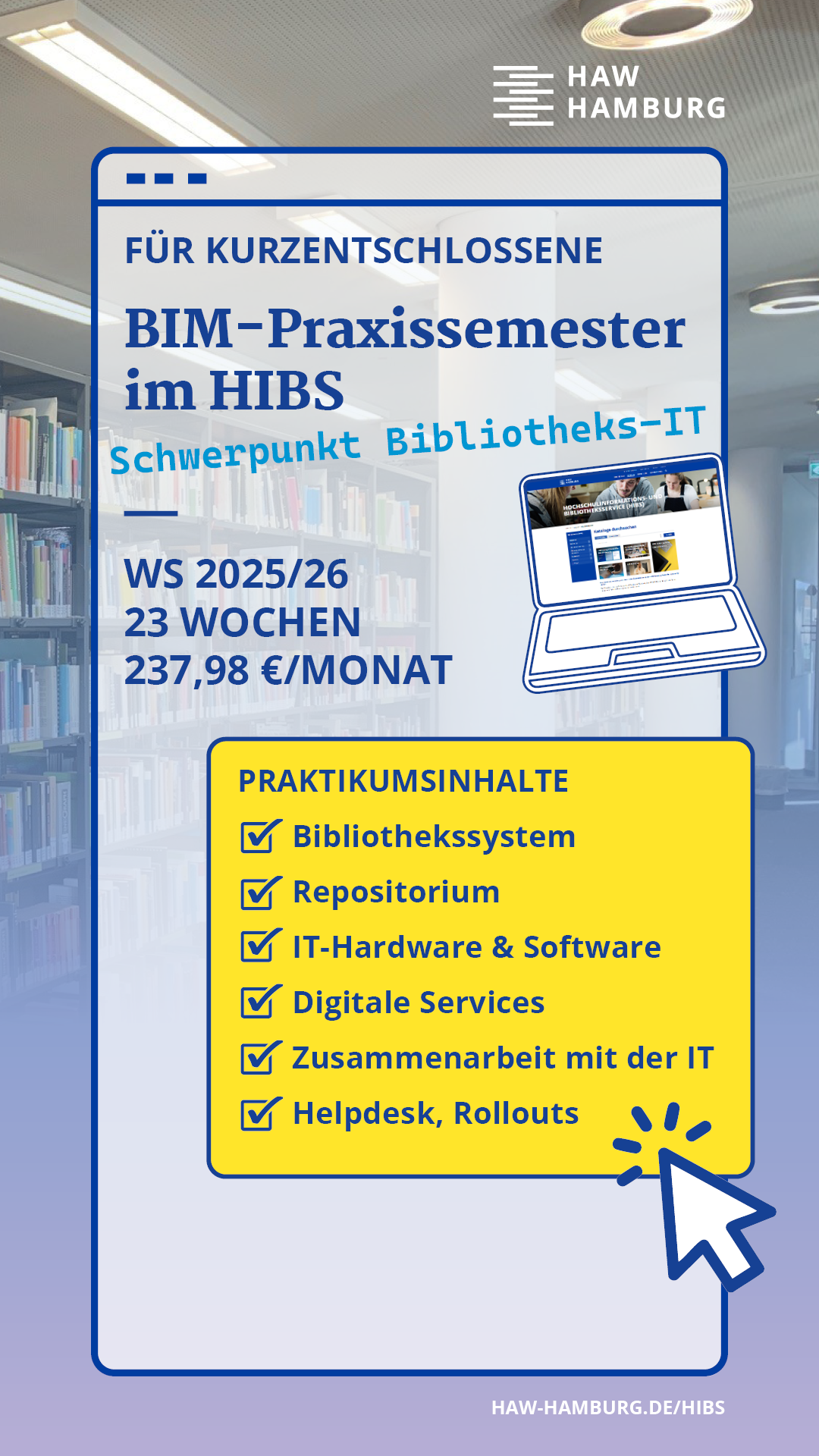 📣 🗣️ 🚨 Für #BIM-Studierende&Co.: #Praxissemester im HIBS! 💡 Wir bieten im Sommersemester 2026 eine #Praktikumsstelle in der Abteilung Digitale Dienste mit dem Schwerpunkt #Bibliotheks-IT an. Dauer: min. 3, max. 6 Monate. Das #Praktikum wird #vergütet. 💶 Mehr Infos und Kontakt 📨 unter https://www.haw-hamburg.de/detail/news/news/show/praxissemester-im-hibs/
