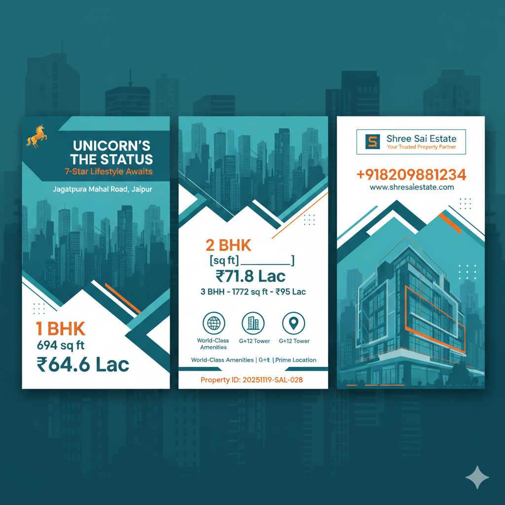 ✨ Experience 7-STAR living at UNICORN'S THE STATUS! Choose from 1/2/3 BHK in this G+12 premium tower at Jagatpura Mahal Road. World-class amenities, prime location, modern architecture. Starting ₹64.6L. Your dream lifestyle starts here!
