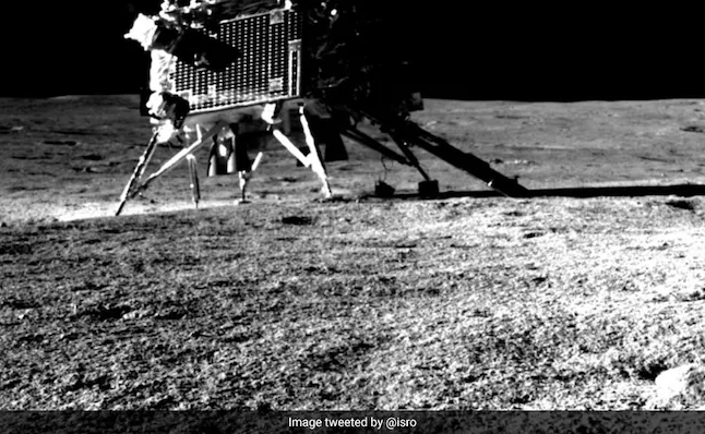 #Chandrayaan3 #PragyanRover shared an image of the #VikramLander clicked using its #NavigationCamera.