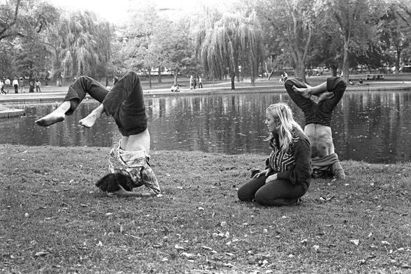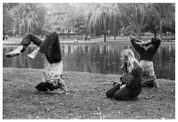 #photography #film #blackandwhite #bw #blackandwhite #boston #massachusetts #publicgarden #park #people #youngpeople #barefoot #yoga #headstand #lagoon #1970s