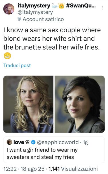 I know a same sex couple where blond wears her wife shirt and the brunette steal her wife fries.