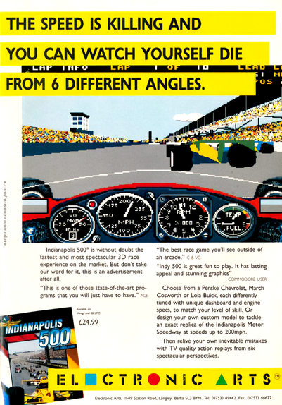 Indianapolis 500 Advertisement from Electronic Arts for the Commodore Amiga. #Commodore #RetroAdvertising