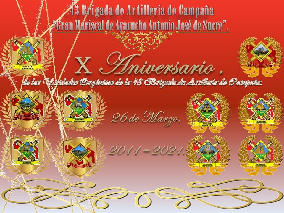 Hoy se cumplen X años de creación de las Unidades Orgánicas de la 43 Brigada de Artillería de Campaña "Gran Mariscal de Ayacucho Antonio José de Sucre", Unidades que nacen en Revolución, con Tecnología de Punta y Mayor Poder de Fuego del País para defender este suelo Sagrado de Bolívar y Chavez.