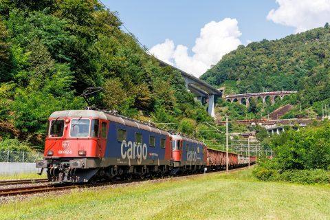 DB 185 Doppeltraktion in der Warteschlaufe Biasca, vor dem Gotthard Südportal