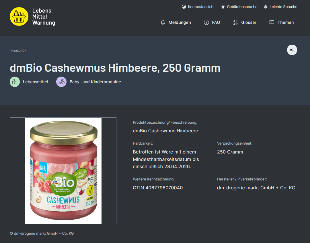 "dm-drogerie markt warnt vor dem Verzehr des Artikels 'dmBio Cashewmus Himbeere' (GTIN 4067796070040). Betroffen hiervon sind alle Mindesthaltbarkeitsdaten (MHD) bis einschließlich 28.04.2026."