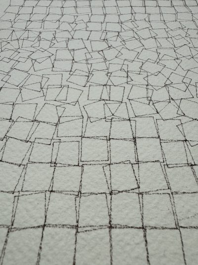 At a high level, it’s a simple and very effective rule – draw a square; repeat, adding a small but increasing amount of rotation (noise) with each column and row. Such a basic piece of code produces a wonderful and pleasing – to my eyes – “disintegration” effect. My description is a very simplistic way of understanding the code – more recently, Zellyn Hunter has done a fabulous two part deep dive on the program, going as far as recovering the random seed used to create the specific piece of work that is part of the collection at the V&A Museum in London1. Until about a month ago I had an alternate / approximated version2 hanging just inside the door of the studio, and thanks to Zellyn I now have a precise recreation generated from Python, plotted using my own machine, on fine black paper using gold ink.