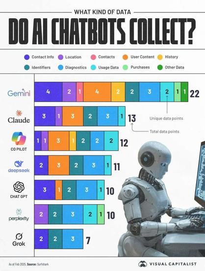 Was sammeln #KI #Chatbots von Dir? Nach den Hypes um #Clouds & #Blockchain, jetzt der neueste #Datensammel #Schrei! Trainiere lieber Deine eigene #Intelligenz! #Google #Gemini #Claude #Microsoft #Copilot #Deepseek #ChatGPT #perplexity #X #Grok #AI #KünstlicheIntelligenz #Datenschutz #Privatsphäre
