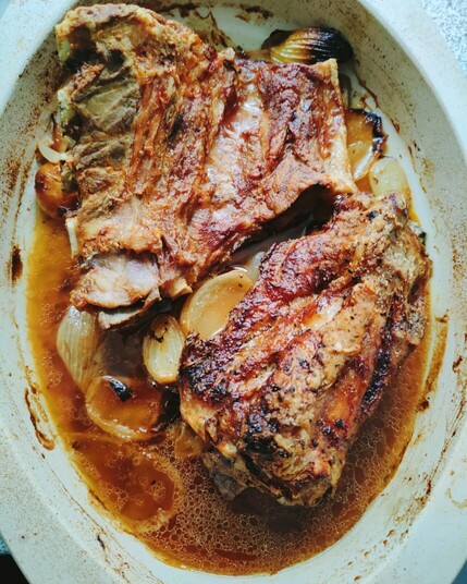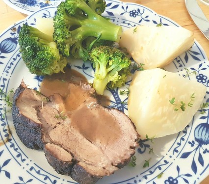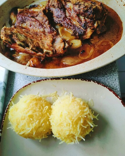Mahlzeit! Guad wars... 😋😊 (Rest kommt in den Gefrierschrank). 🧑🍳🍽️🍖 Schweinsbratn mit Krustn, dazua Omaknedl. Omaknedl (Teigknödel) Rezept: Spätzleteig, nicht zu dünn und nicht zu fest, Semmelwürfel rein, ins kochende Salzwasser geben und ca. 15-20 Min. köcheln lassen) #Foodporn #Schweinebraten