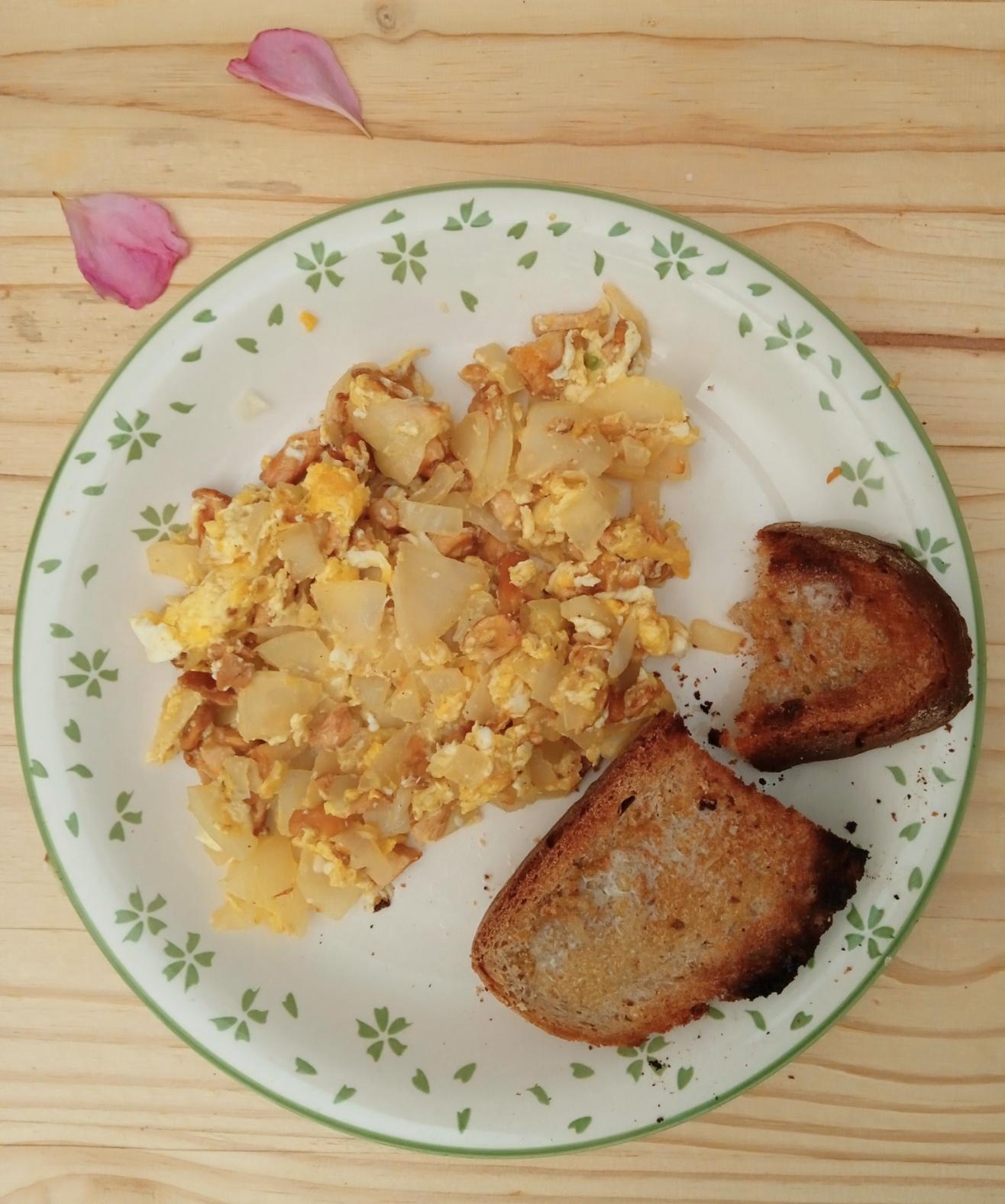#scrambledeggs with #chanterelle mushrooms I found yesterday, and sourdough from the village bakery.