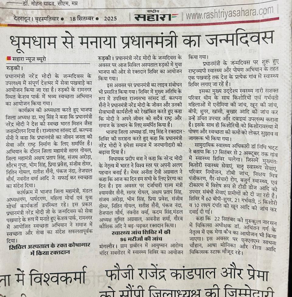 рд╡рд┐рдХрд╕рд┐рдд рднрд╛рд░рдд рдХреЗ рд╢рд┐рд▓реНрдкрдХрд╛рд░, рд╡рд┐рд╢реНрд╡ рдХреЗ рд╕рд░реНрд╡рд╛рдзрд┐рдХ рд▓реЛрдХрдкреНрд░рд┐рдп рдиреЗрддрд╛, рдЖрджрд░рдгреАрдп рдкреНрд░рдзрд╛рдирдордВрддреНрд░реА рд╢реНрд░реА @Narendra Modi рдЬреА рдХреЗ рдЬрдиреНрдорджрд┐рд╡рд╕ (рд╕реЗрд╡рд╛ рджрд┐рд╡рд╕) рдХреЗ рдЕрд╡рд╕рд░ рдкрд░ рд░реБрдбрд╝рдХреА рдореЗрдВ рджреЗрд╡рднреВрдорд┐ рдорд╛рдирд╡рд╛рдзрд┐рдХрд╛рд░ рд╕реЗрд╡рд╛ рд╕рдВрдШ рджреНрд╡рд╛рд░рд╛ рдЖрдпреЛрдЬрд┐рдд рд╕реНрд╡реИрдЪреНрдЫрд┐рдХ рд░рдХреНрддрджрд╛рди рд╢рд┐рд╡рд┐рд░ рдореЗрдВ рдкреНрд░рддрд┐рднрд╛рдЧ рдХрд┐рдпрд╛ред