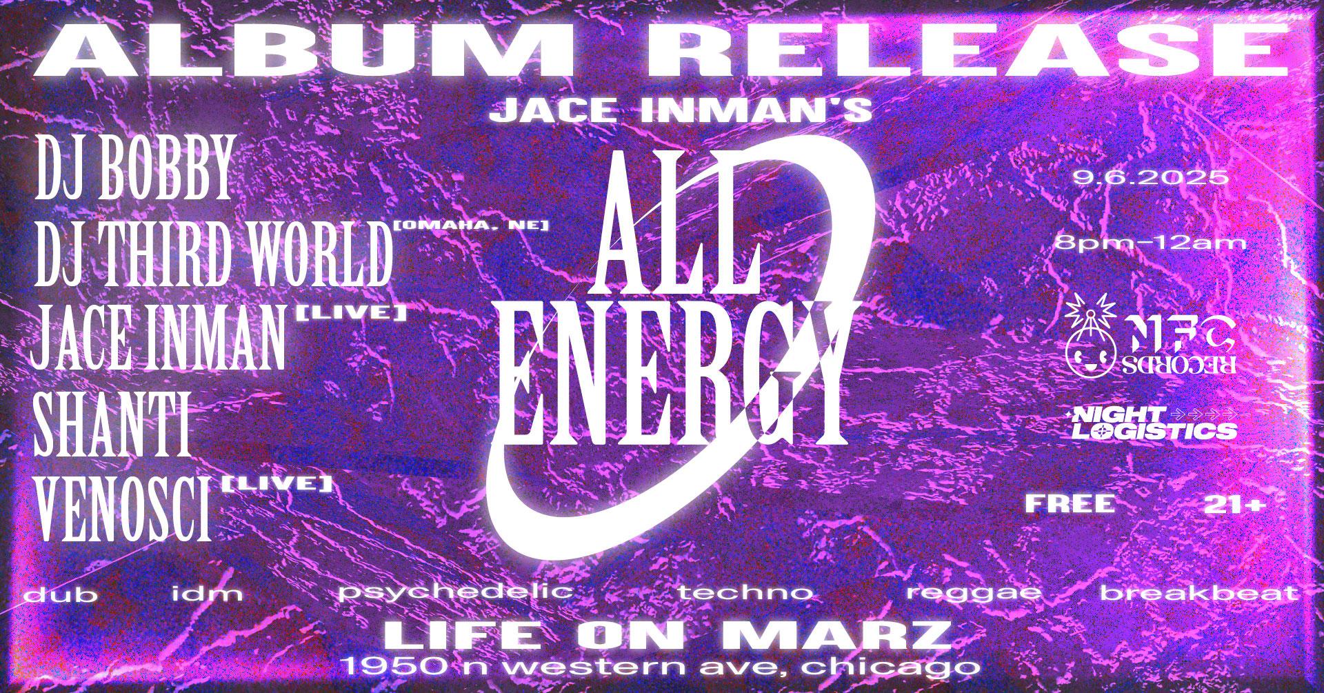 NFC Records presents: All Energy album release party @ Life On Marz Community Club - 06 Sep feat. Jace Inman, Shanti