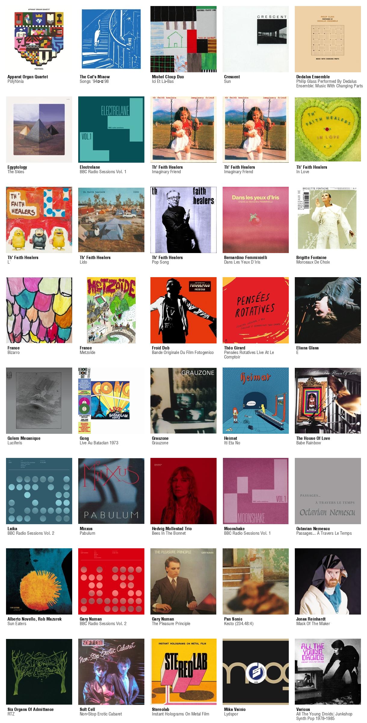 ![Collage des pochettes des albums de Apparat Organ Quartet (Pólýfónía), The Cat's Miaow (Songs '94-'98), Michel Cloup Duo (Ici Et Là-Bas), Crescent (Sun), Dedalus Ensemble (Philip Glass Performed By Dedalus Ensemble: Music With Changing Parts), Egyptology (The Skies), Electrelane (BBC Radio Sessions Vol. 1), Th' Faith Healers (Imaginary Friend), Th' Faith Healers (Imaginary Friend [LP]), Th' Faith Healers (In Love), Th' Faith Healers (L'), Th' Faith Healers (Lido [LP]), Th' Faith Healers (Pop Song), Bernardino Femminielli (Dans Les Yeux D'Iris), Brigitte Fontaine (Morceaux De Choix), France (Bizarro), France (Metzoïde), Froid Dub (Bande Originale Du Film Fotogenico), Théo Girard (Pensées Rotatives Live At Le Comptoir), Eliana Glass (E), Golem Mecanique (Luciferis), Gong (Live Au Bataclan 1973), Grauzone (Grauzone), Heimat (Iti Eta No), The House Of Love (Babe Rainbow), Laika (BBC Radio Sessions Vol. 2), Minxus (Pabulum), Hedvig Mollestad Trio (Bees In The Bonnet), Moonshake (BBC Radio Sessions Vol. 1), Octavian Nemescu (Passages... À Travers Le Temps), Alberto Novello, Rob Mazurek (Sun Eaters), Gary Numan (BBC Radio Sessions Vol. 2), Gary Numan (The Pleasure Principle), Pan Sonic (Kesto (234.48:4)), Jonas Reinhardt (Mask Of The Maker), Six Organs Of Admittance (RTZ), Soft Cell (Non-Stop Erotic Cabaret), Stereolab (Instant Holograms On Metal Film), Mika Vainio (Lydspor), Various (All The Young Droids: Junkshop Synth Pop 1978-1985)](https://files.mastodon.social/cache/media_attachments/files/114/968/863/777/264/528/small/c1fa91b939346b2c.jpg)