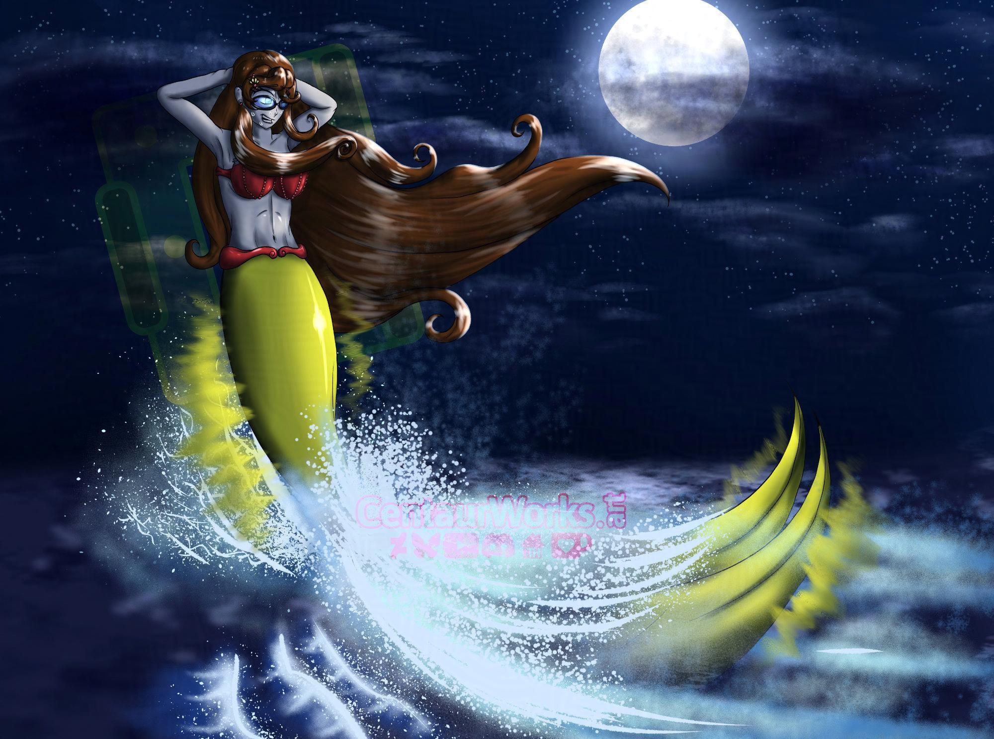 #MastoArt #Mermay #Mermaid #Skimming #tailwalking #night #moon #longhair #glasses #Yellow #ocean #art #art2025 #digitalart #digitalartwork #artwork #CentaurWorks #OC #anime #animestyle #animeartstyle #originalcharacter #clipstudiospaint