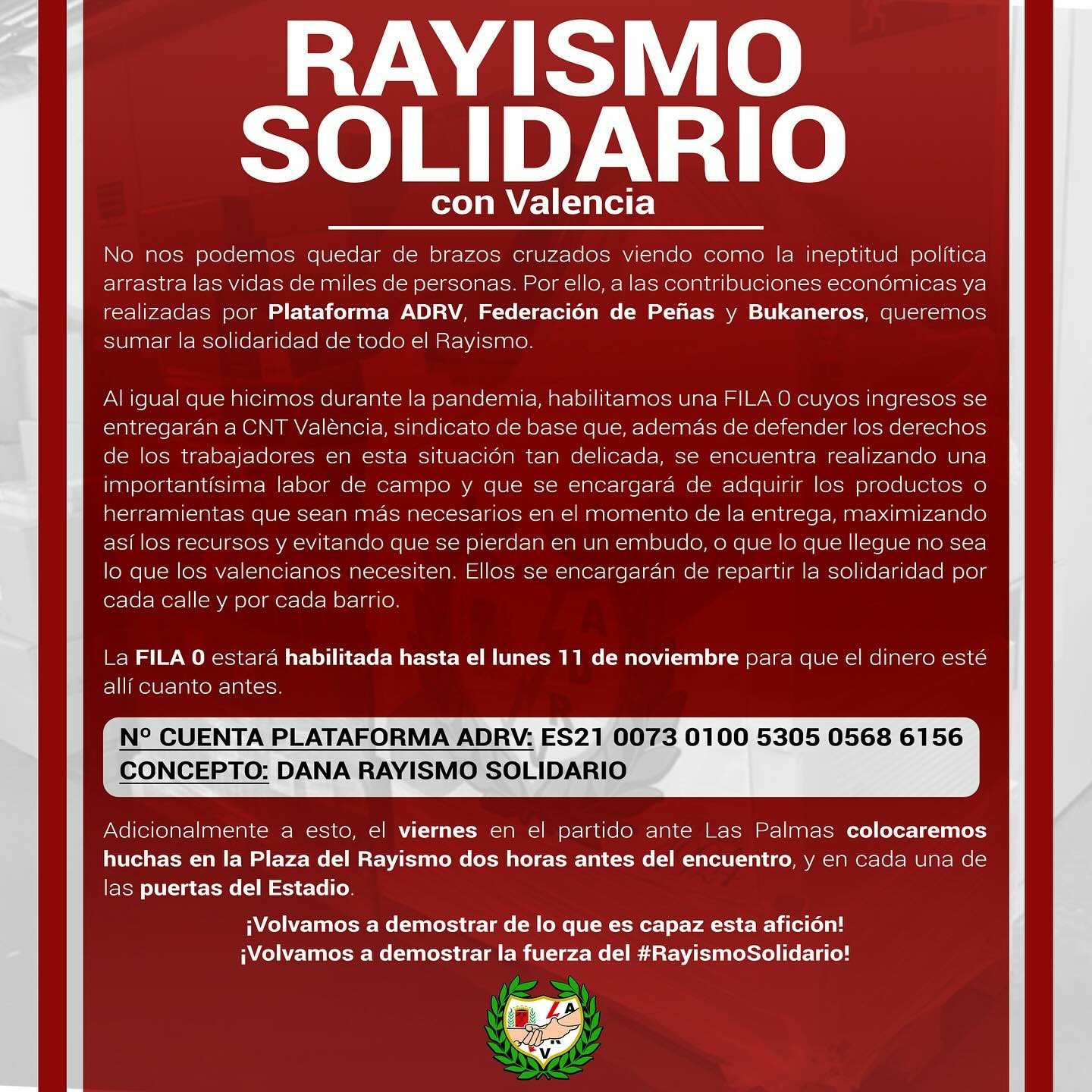 La Plataforma de ADRV, la Plataforma de Peñas del Rayo Vallecano y la peña Bukaneros convocan una vez más una campaña de RAYISMO SOLIDARIO en esta ocasión, para apoyar a las personas afectadas por la DANA en Valencia.