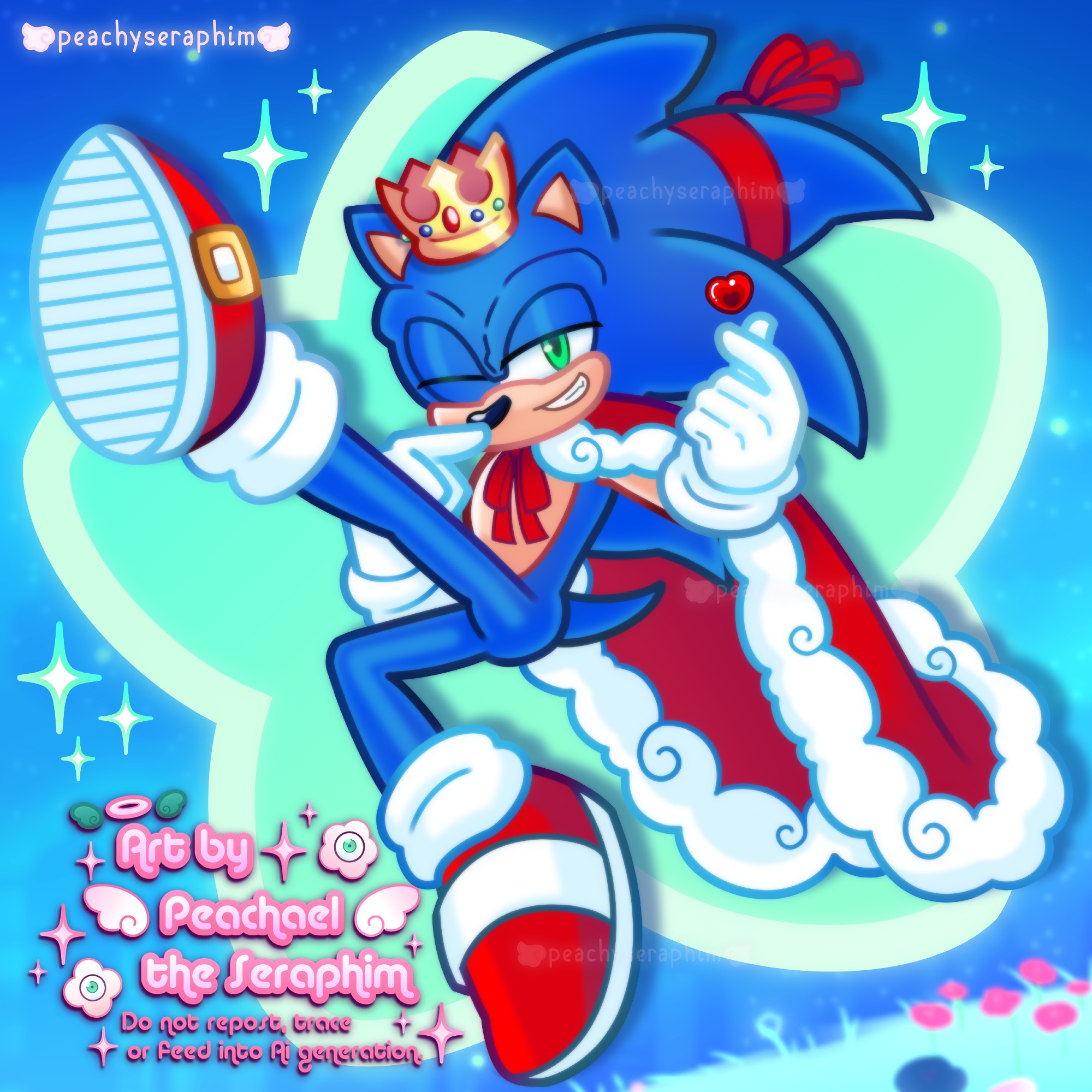 Sonic the Hedgehog winking with in a dynamic mid air pose kicking his foot up. One of his hands is pinching fingers into a heart like shape and have a lil heart above them. Sonic is wearing his birthday crown, red cape with fluffy white outline and a matching red ribbon on his middle quill