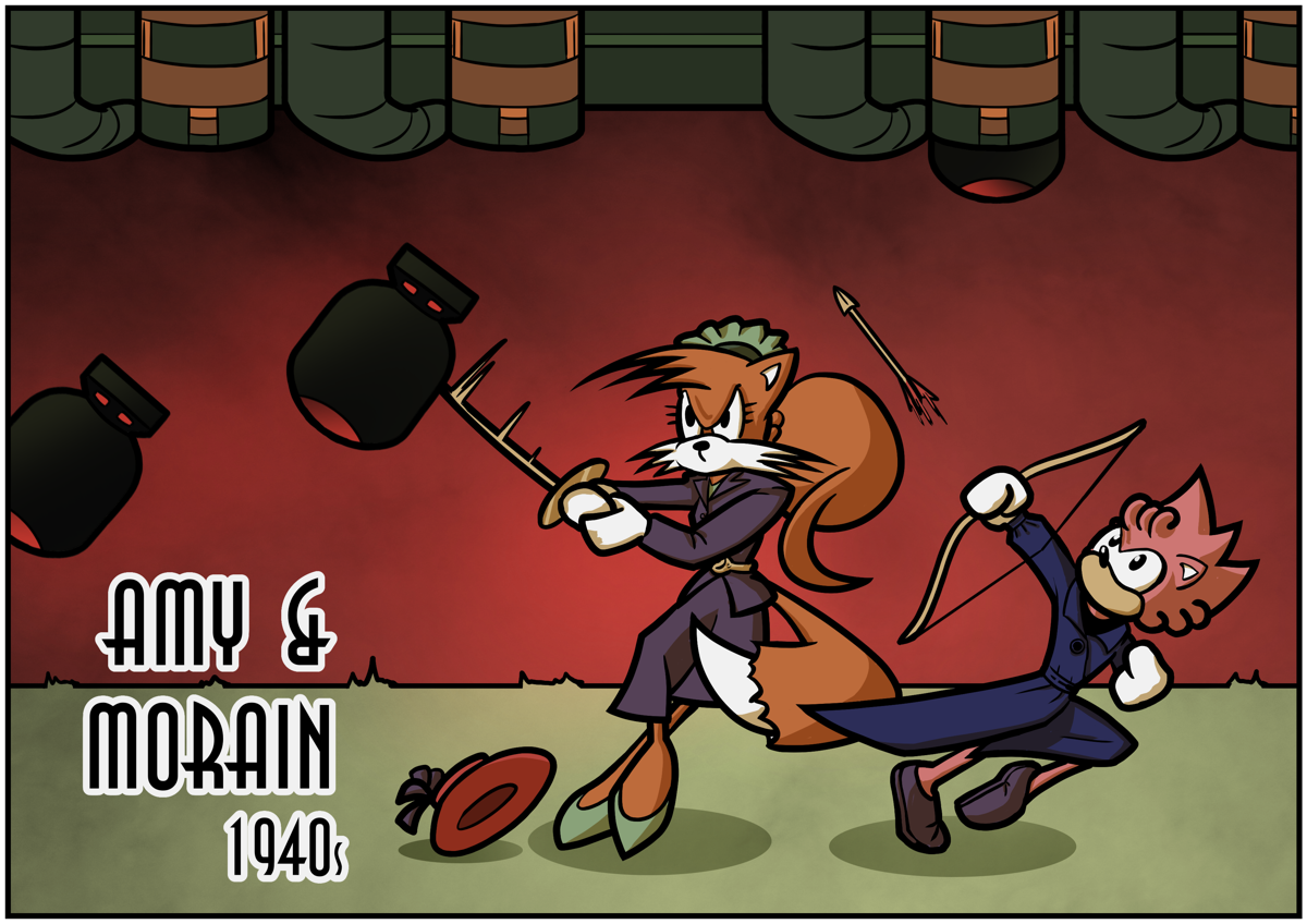 Amy and Morain are running through the pre-boss bomb section from Angel Island Act 2. Morain's spinning to attack a bomb with her sword while Amy is shooting an arrow at the aircraft. Both are dressed in 1940s style woolen suits. The caption read "Amy & Morain: 1940s"