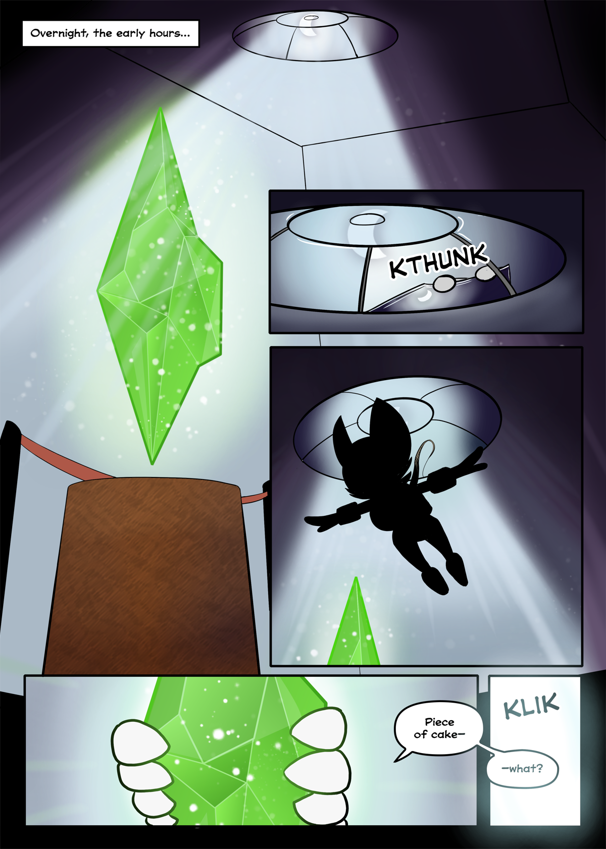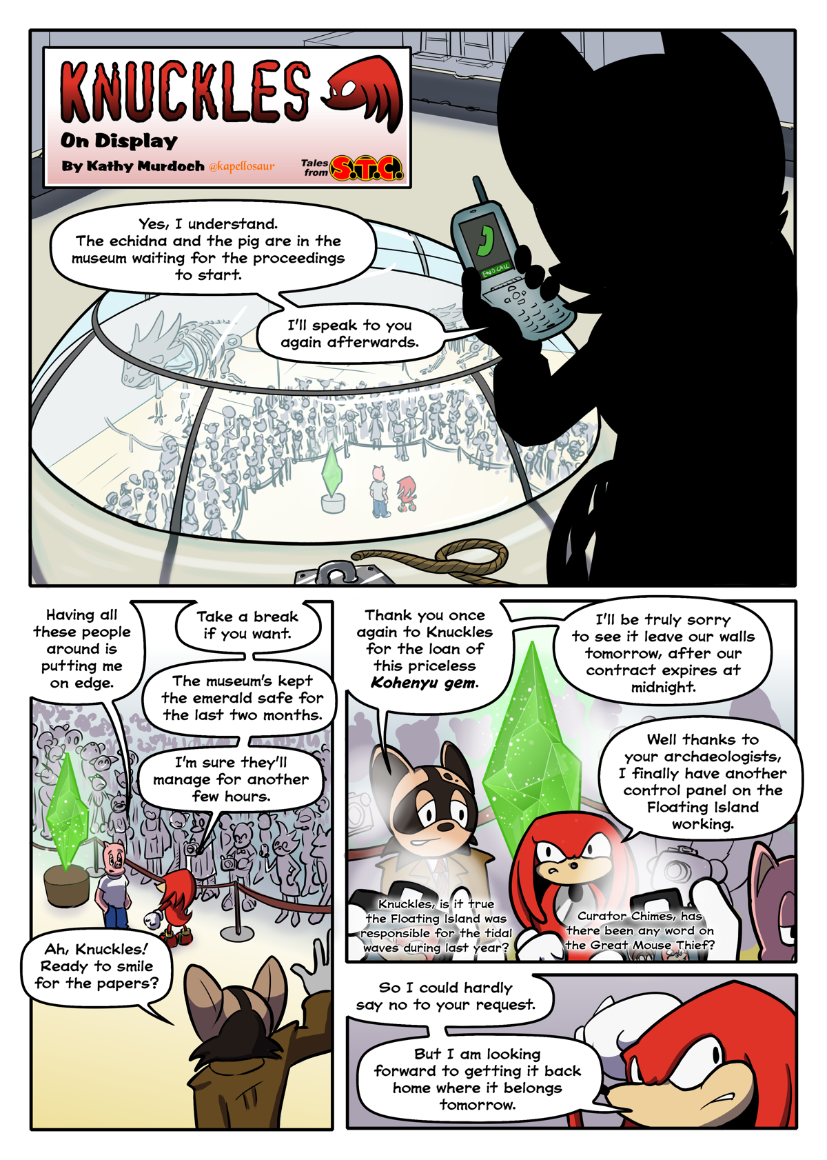 1. An unidentified character in silhouette is talking on the phone, looking down through the skyroof of a museum into the exhibition chamber where we can see Knuckles and Porker standing next to a podium.