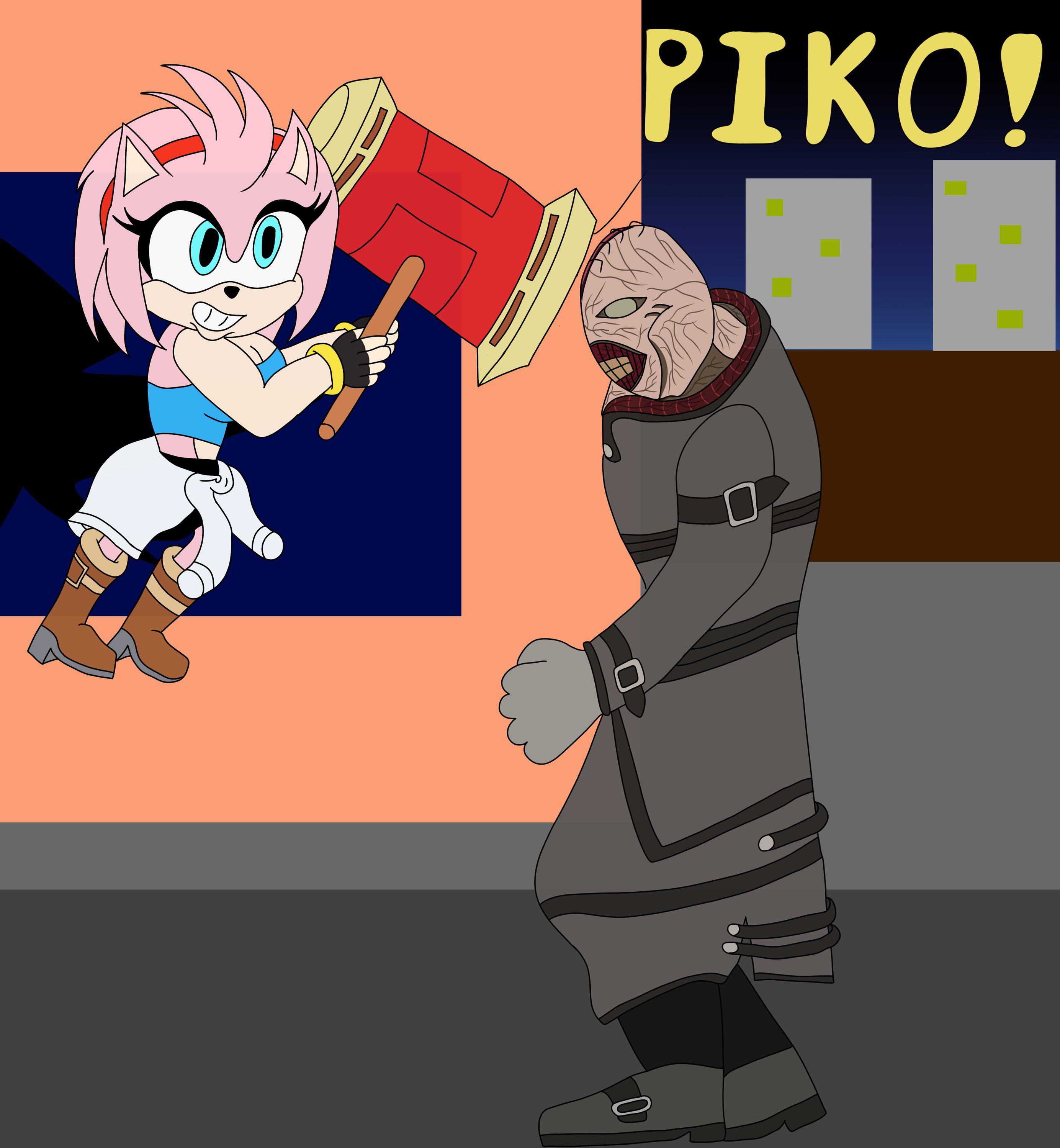 Amy Rose, dressed as Jill Valentine, bops Nemesis atop his bonce with the Piko - Piko Hammer.