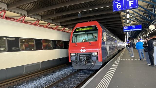 Der IC8 von Winterthur nach Romanshorn war eine S-Bahn-Doppelstock-Komposition der ersten Generation (die mit der blauen Lok). Der Lautsprecher-Durchsage in Winterthur entsprach der Zug durchaus: Geänderte Formation, kein Speisewagen und kein Familienwagen.