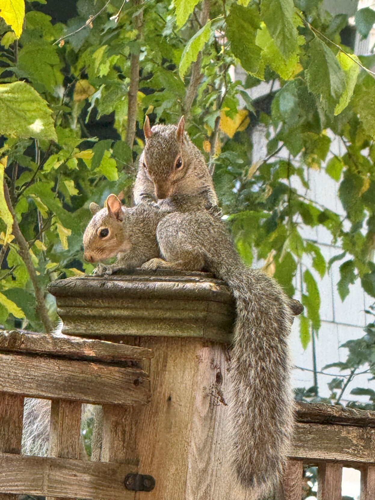 Parent and juvenile squirrel on fence.Parent and juvenile squirrel on fence.Parent and juvenile squirrel on fence.
