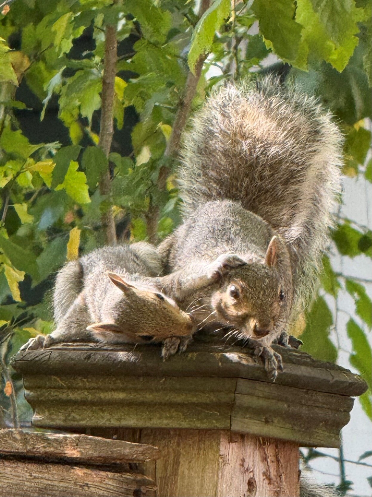 The squirrels I have been feeding brought their baby over today to learn about where the hazelnuts come from and to do some grooming. #squirrel