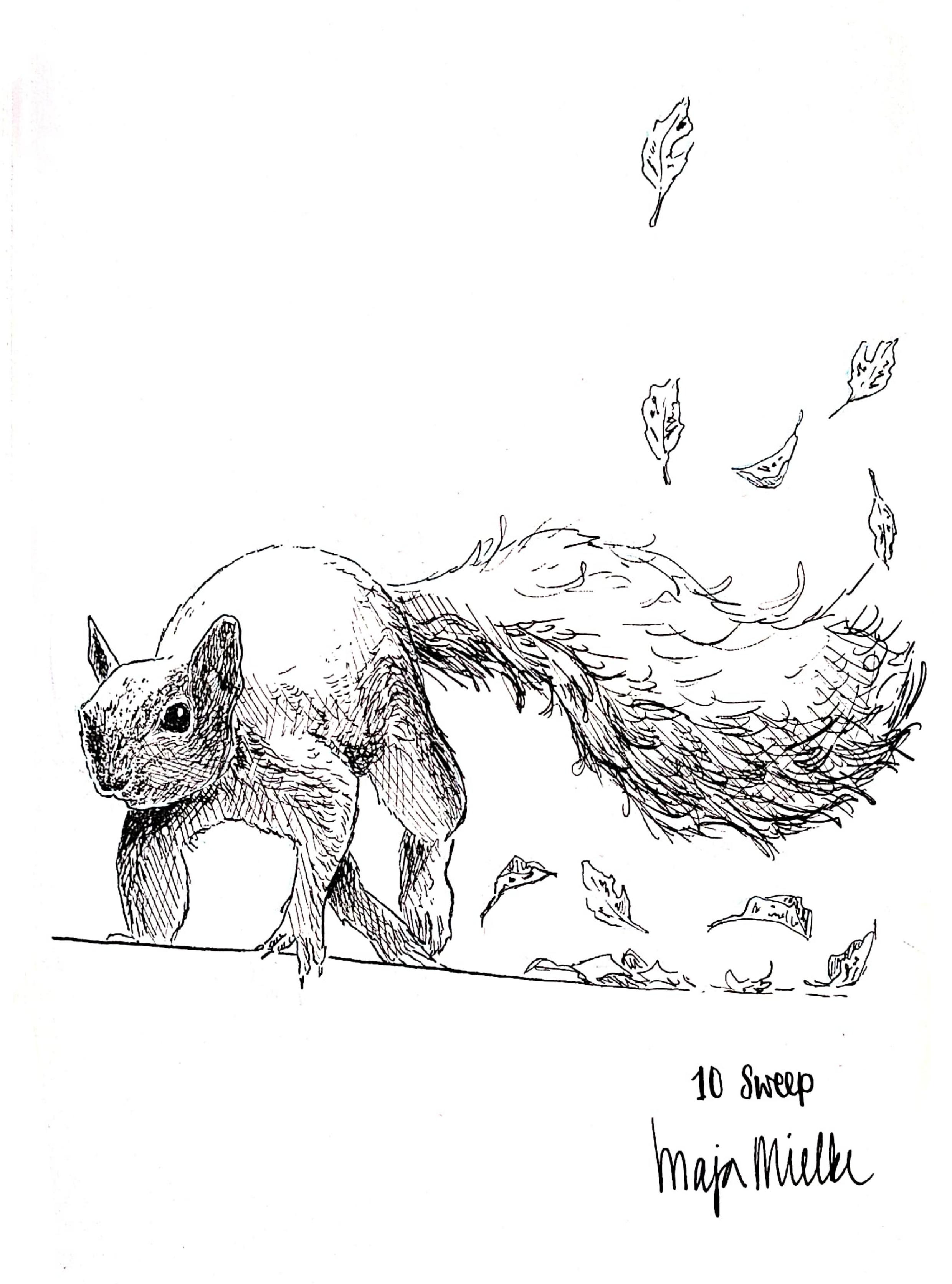 Pen and ink drawing of a squirrel running over a surface with autumn leaves. Some of the leaves are flying up behind the bushy tail.