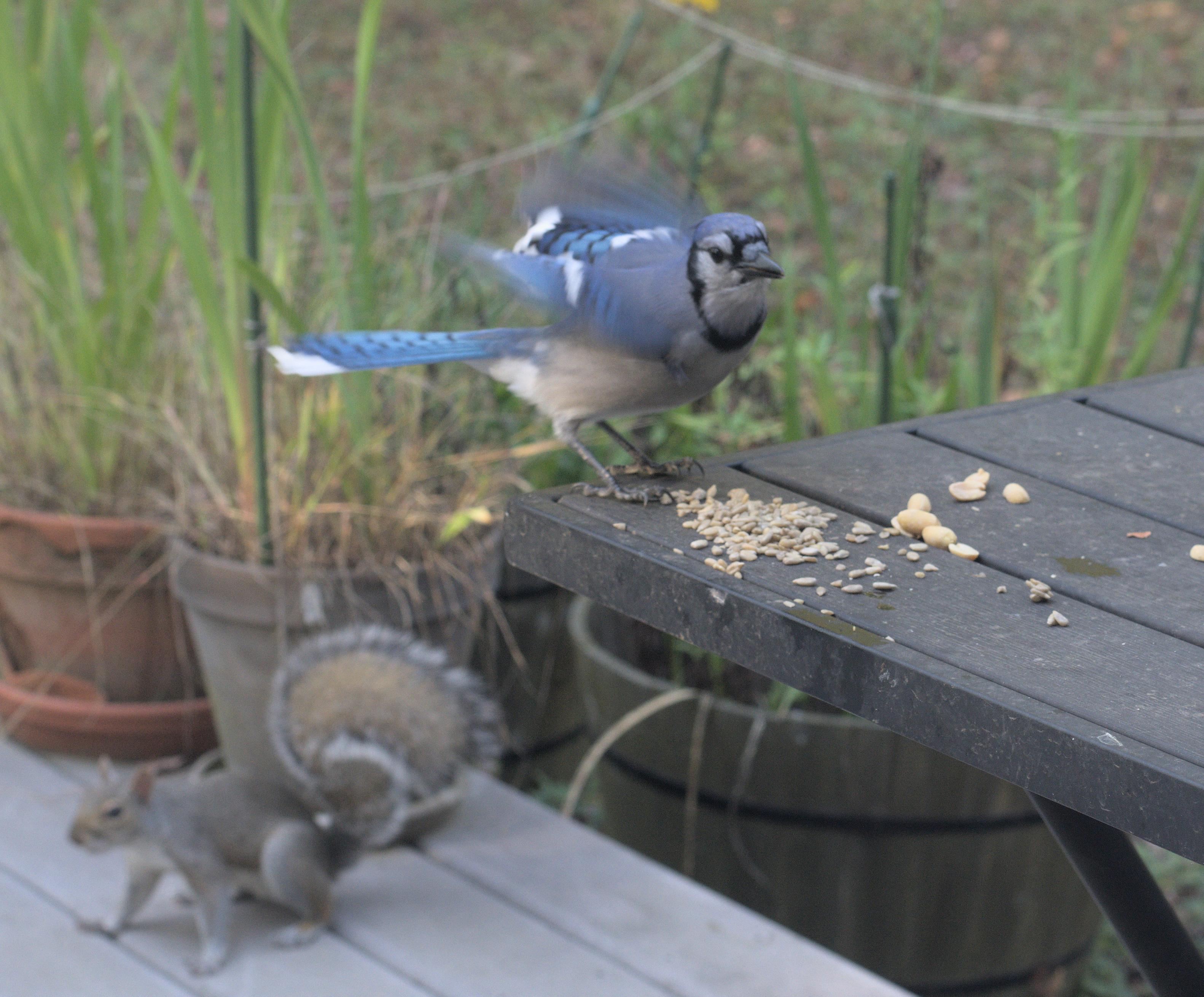 A blue jay lands on the table on my deck to eat sunflower seeds and peanuts. in the background, a squirrel looks for seeds on the deck.