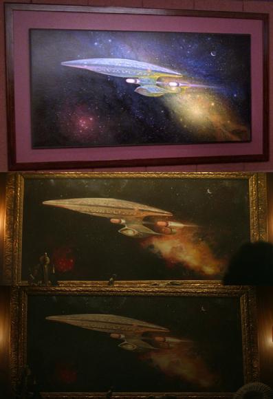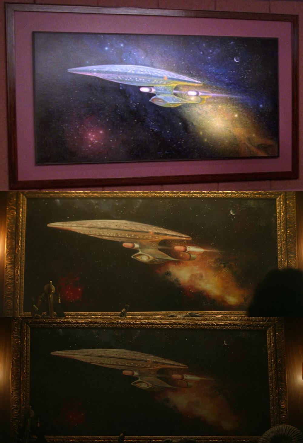 #StarTrekTNG's "Qpid"⬆️ gives us one of the best looks at Picard's Enterprise-D ready room painting, as it appears before the retouches between seasons 4 and 5. The recreation of the painting from seasons 2 and 3 of #StarTrekPicard can be seen in the middle and bottom pics.